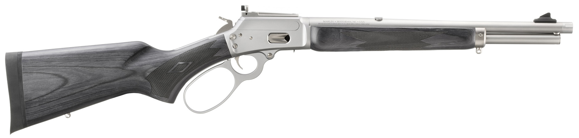 Caliber 44 Rem Mag / 44 Special – Capacity 8/9 – Stock Black Laminate – Material Stainless Steel – Finish Satin Stainless – Front Sight Skinner Sights Blade – Rear Sight Skinner Sights Adjustable – Weight 6.3 lbs. – Overall Length 33.25” – Length of Pull 13.38” – Barrel Length 16.10” – Thread Pattern 5/8”-24 – Thread Cap Match-Polished – Twist 1:20” RH – Grooves 6 – Barrel Cold Hammer-Forged Stainless Steel – Receiver lever and trigger guard plate are CNC machined from 416 stainless steel forgings. – Barrel is made of 410 stainless steel and is cold hammer-forged which results in ultra-precise rifling that provides exceptional accuracy and longevity. – Threaded barrel with factory-installed thread protector has a 5/8”-24 pattern to accommodate a muzzle brake or other barrel accessories. – Stainless steel components have a satin non-shiny finish. – Adjustable Skinner Sights receiver-mounted peep sight is perfect for rapid target acquisition. – Tubular magazine features a loading gate located on the receiver and will accept 8 rounds of .44 Rem Mag or 9 rounds of .44 Special ammunition. – Soft-rubber buttpad effectively absorbs recoil. – Positive push-button cross-bolt manual safety and traditional half-cock hammer. – Reliably feeds a wide range of .44 Rem Mag and .44 Special factory ammunition. – Durable laminate buttstock and forend remain dimensionally stable in varying weather conditions. – Sharp checkering provides an excellent grip in all weather conditions. – Oversized lever loop provides clearance for operation with heavy gloves. – Slim forend for an attractive look and comfortable feel. – Also includes: Sling swivel studs offset hammer spur.