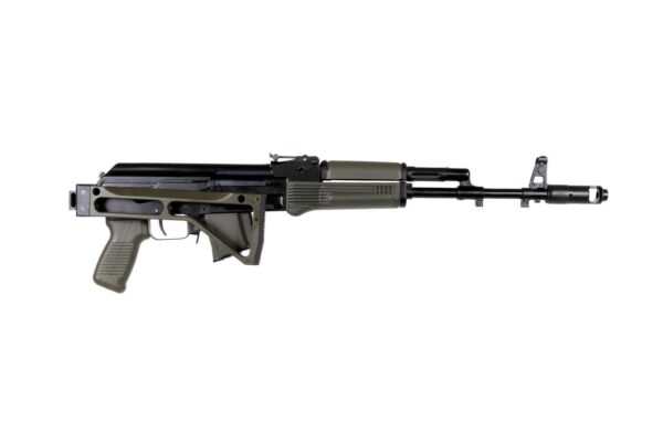 Arsenal SAM7SF 7.62x39mm caliber rifle milled and forged receiver enhanced FCG chrome lined hammer forged barrel 24×1.5mm muzzle right hand threads AK-140US muzzle brake bayonet and accessory lugs aluminum right-side folding stock with ergonomic cheek rest and QD points OD Green polymer pistol grip and handguards stainless steel heat shield ambidextrous safety lever scope rail and one OD Green 10-round magazine.