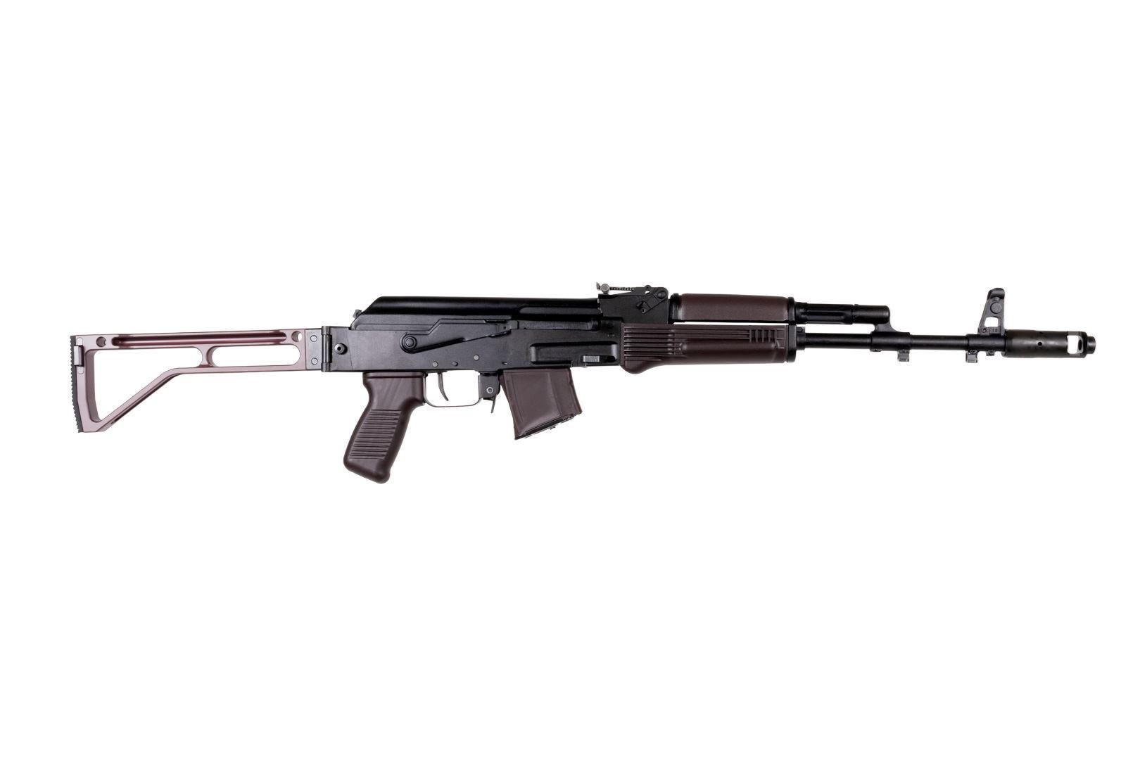Arsenal SAM7SF 7.62x39mm caliber rifle milled and forged receiver enhanced FCG chrome lined hammer forged barrel 24×1.5mm muzzle right hand threads AK-140US muzzle brake bayonet and accessory lugs aluminum right-side folding stock with ergonomic cheek rest and QD points Plum polymer pistol grip and handguards stainless steel heat shield ambidextrous safety lever scope rail and one Plum 10-round magazine.