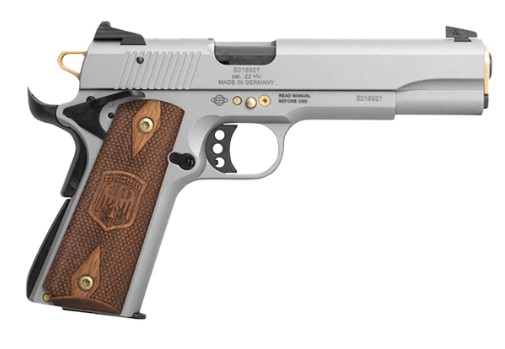 American Tactical Inc (ATI), MFG# GERG2210M1911AN15, UPC: 810113113739, UOM: EA, GSG 1911 15th Annivesary, .22 LR, 5″ Threaded Barrel, Fixed Sights, Frost Grey, Gold, Wood, 10-rd, AMT, AMTHG10, AMTHGALL, HG10, HGALL