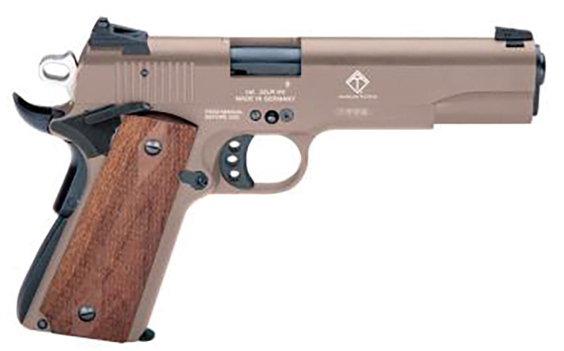 American Tactical Inc (ATI), MFG# GERG2210M1911T, UPC: 813393018442, UOM: EA, GSG 1911, 22LR, 5″ Threaded Barrel, Fixed Sights, Tan, Walnut Grips, 10-rd, AMT, AMTHG10, AMTHGALL, HG10, HGALL