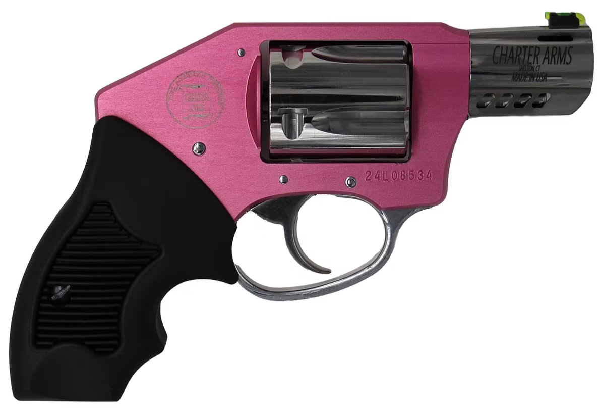 The Charter Arms® Coyote Series is a new series of rimless revolvers that utilize moon clips. The Coyote is the smallest lightest .380 five-shot revolver on the market. Providing a sleek concealable firearm for personal protection. The ease to carry and handle with its light weight and low recoil allows new defense ammunition to be shot effortlessly. Equipped with a ported barrel and diamond cuts the combination of stainless steel and aircraft aluminum as well as two moon clips make the Coyote a top choice for self-defense carry. – Caliber: .380 ACP – Capacity: 5 Shot – Frame: Small – Frame Material: Aluminum – Finish: Pink Anodized Frame & Hi-Polish Components – Grip: Small Compact Rubber – Sights: LitePipe – Hammer: Concealed – Barrel: 2 Ported – Weight: 13 Ounces – Length: 6.25 – Height: 4.25