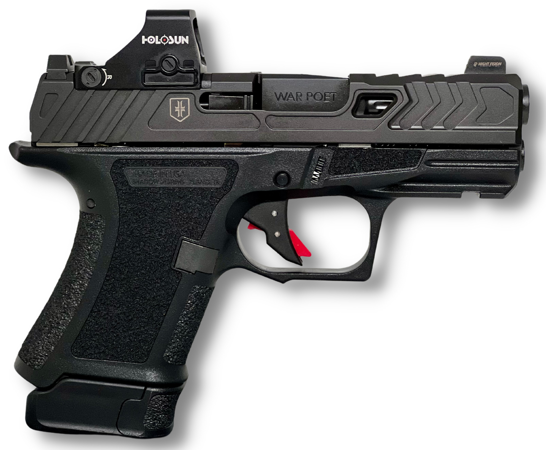 CR920 Pistol 9MM Black Frame War PoetEdition Fluted Unthreaded Black SS Rod GrnTrit 1D Holosun 507K13 Round w/ 10 RoundMag – ADDITIONAL PARTS: Comes with 2xShadow Systems Magazines pinkyextension range bag and ShadowSystems tool – WEIGHT: 15.42 ounces – LENGTH: 6.36 inches – HEIGHT: 4.31 inches – BARREL: 3.4 inch barrel – FINISH: Nitride – TRIGGER: 4-4.5 lb trigger pull – WIDTH: 1.06 inches – CAPACITY: 10+1 flush mag13+1 extended mag