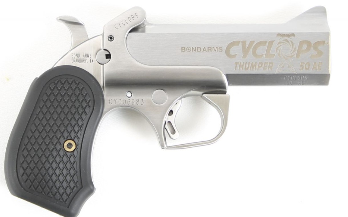 Bond Arms, MFG# BACYP – 50 AE, UPC: 855959009600, UOM: EA, Cyclops Big Bore, .50 AE, 4.25″ Barrel, B6 Grip, Leather Holster, Stainless, Single Shot, BOND, BONDHG25, BONDHGALL, HG25, HGALL