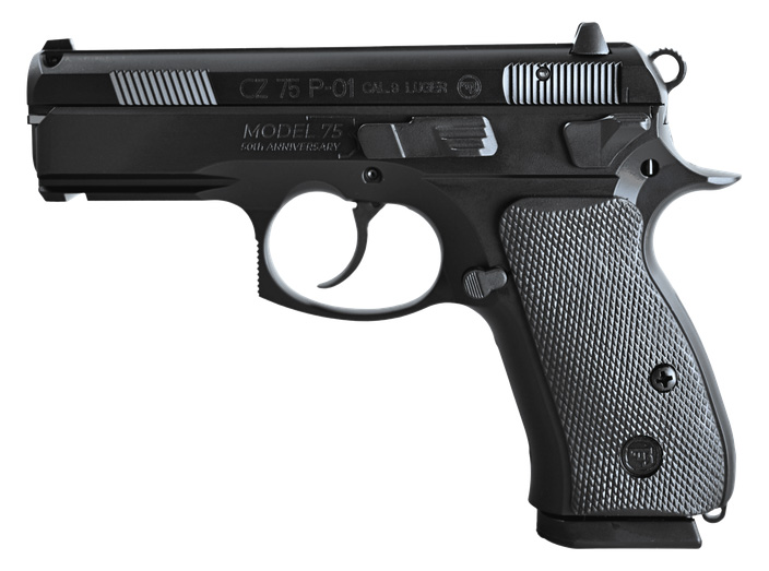 Built for duty use with an alloy frame decocker and accessory rail the CZ P?01 offers rugged reliability with a DA/SA trigger. This year’s 50th Anniversary model features commemorative frame engraving celebrating 50 years of the CZ 75 lineage. – Caliber 9 × 19 – Magazine capacity 15+1 – SKU 91297 – Safety features Decocker Safety notch on the hammer Firing pin block – Grips Rubber – Frame material 7075 T6 aluminum alloy – Trigger reset 0.3 in – Trigger travel SA: 0.4 DA: 0.6 in – Trigger pull SA: 4.5 DA: 10.3 lbs – Trigger type SA/DA – Thread No – Sights Fixed – Barrel length 3.75 in – Height 5.0 in – Width 1.4 in – Length 7.25 in – Weight with empty magazine 28.1 oz