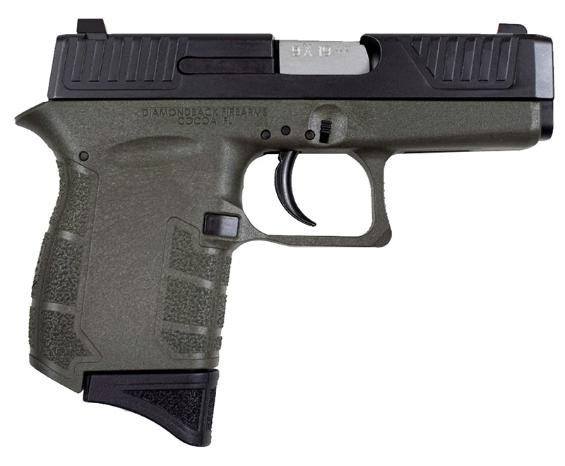 Diamondback, MFG# DB0200P101, UPC: 810035752603, UOM: EA, DB9 Gen 4, 9mm, 3.1″ Barrel, 3-Dot Sights, Slide Stop, ODG/ODG ,6rd., DIAM, DIAMHG10, DIAMHGALL, HG10, HGALL