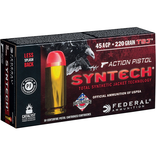 Optimized for action shooting sports power factor requirements – Reduced felt recoil – Flatter than typical nose profile for better energy transfer to steel targets – TSJ eliminates copper and lead fouling while extending barrel life – Lead-free primer formulation provides reliable consistent ignition – Clean-burning propellants minimize residue – Drastically reduces splash-back on steel targets – Cartridge: 45 ACP – Quantity: 50 Round – Grain Weight: 220 Grains – Muzzle Velocity: 775 Feet Per Second – Muzzle Energy: 293 Foot Pounds – Bullet Style: Total Synthetic Jacket (TSJ)