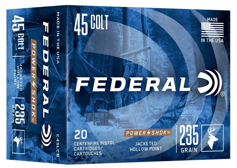 Short barrel performance that goes the distance. Handgun hunters can get the reliability and accuracy they need at an affordable price with Federal® Power-Shok® loads. The rounds feature a powerful jacketed hollow-point bullet suited to a variety of big game. – Reliable performance for handgun hunters – Jacketed hollow-point bullet suited to a variety of big game – Affordably priced – Specs – Caliber 45 Colt – Grain Weight 235 – Bullet Style Jacketed Hollow Point – Muzzle Velocity 850 – Test Barrel Length In 6-V – Package Quantity 20 – Usage Big Game