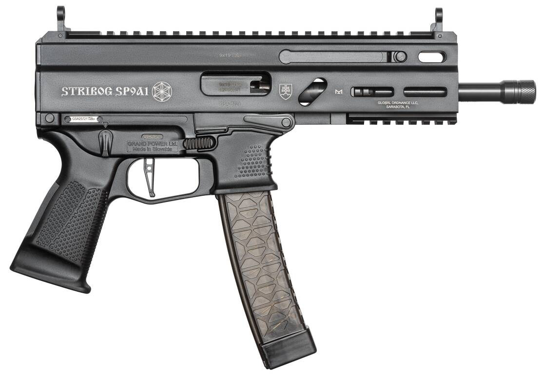The Grand Power Stribog Grand Power Stribog SP9A1 9mm Sub Pistol is a Slovakian-made firearm imported by Global Ordnance. This model operates via a direct blowback system delivering consistent performance and reliability. Chambered in 9mm it features a 8 Threaded Barrel (1/2×28) ready for your preferred muzzle device. It ships with 3x 30rd Grand Power proprietary magazines. Built-in sights allow for out-of-the-box readiness. Fully ambidextrous controls and a non-reciprocating charging handle. Includes a molded hard carrying case. Built around a rugged aircraft-grade aluminum upper with a polymer lower and outfitted with a 1913 picatinny backplate & qd sling socket for optimal control and adaptability. – Direct Blowback – 9mm 8 Threaded Barrel (1/2×28) – 3x 30rd Grand Power Proprietary Magazines 1913 Picatinny Backplate & QD Sling Socket – Alloy Upper Polymer Lower Black Hardcoat Anodized