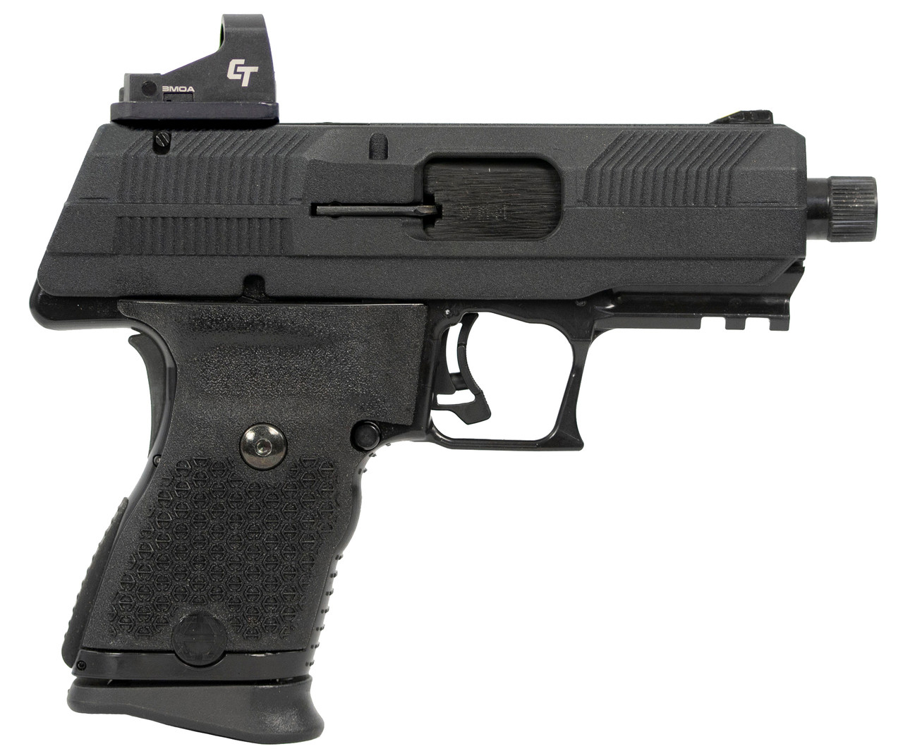 Semi-Auto Pistol – Striker Fired – 9mm Luger – 10 Rounds – 4.22 Threaded Barrel – 1/2×28 Thread Pitch – Three Dot Fully Adjustable Sights – Magazine Disconnect Safety – High-Impact Polymer Frame – Red Dot Ready – Easy Grip Finish – Manual Thumb Safety – Magazine Safety – 1913 Picatinny Accessory Rail – Overall Length: 7.6 – Weight: 35 oz – Color: Black