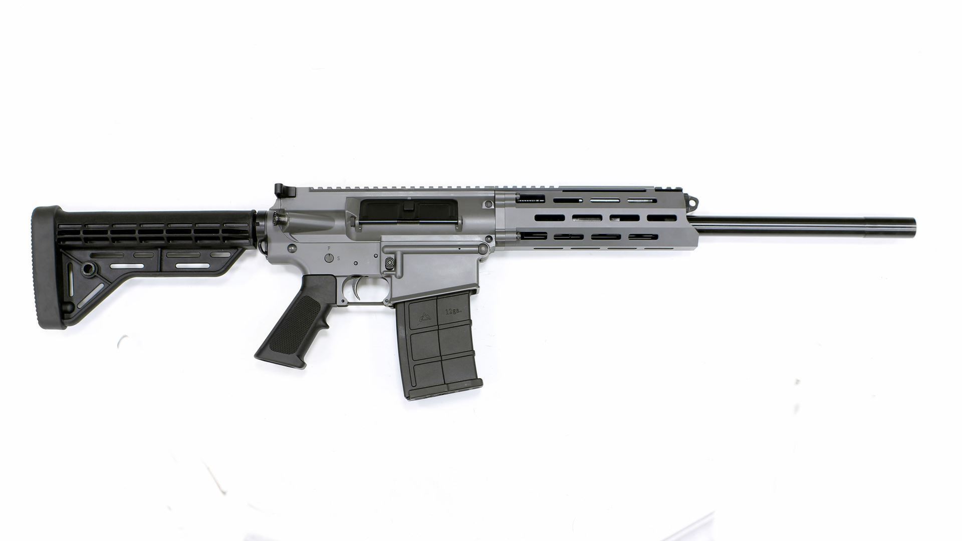 Semi-Auto AR-style 12 GA shotgun chambers 2 ¾” and 3” shells Multi-coated scratch resistant grey coating Aluminum forearm Removable AR front and rear sights Picatinny rail 4-position gas system Chrome lined barrel two 5 round magazines fits Rem Choke.