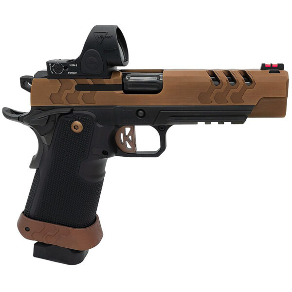 KIMBER 2K11 TARGET OI TRIJICON SRO 9MM 20RD 5″ FLUTED & RAMPED HIGHLY POLISHED W/ DLC COATED BARREL; CUSTOM FRONT & REAR SLIDE LIGHTNING CUTS; BRUSH POLISH FLATS W/ COYOTE PVD COATING; TAG PRECISION FIBERLOK 2 FRONT SIGHT; PICATINNY RAIL; 1 X 17RD & 2 X 20RD MAGS