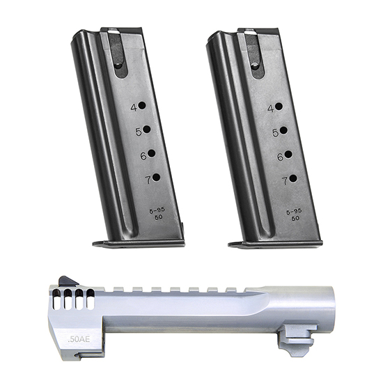 Convert your Mark XIX Desert Eagle .44 Magnum to a .50AE with this conversion kit! Conversion kit includes one Desert Eagle .50AE 6 Brushed Chrome;Barrel with Integral Muzzle Brake and two 7 round Magazines
