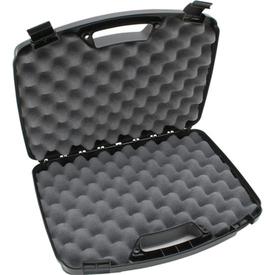 This case is made to carry either two automatics or two revolvers with barrels up to 8. There is also space available for a trigger lock (not included) and comes with easy to open snap latches. The case includes two pad lock tabs for security. – For 2 Automatics or 2 revolvers with barrel up to 8. – 15.5 x 12.2 x 3.6 (Outside Dim.) – 14.7 x 10.6 x 3.3 (Inside Dim.)