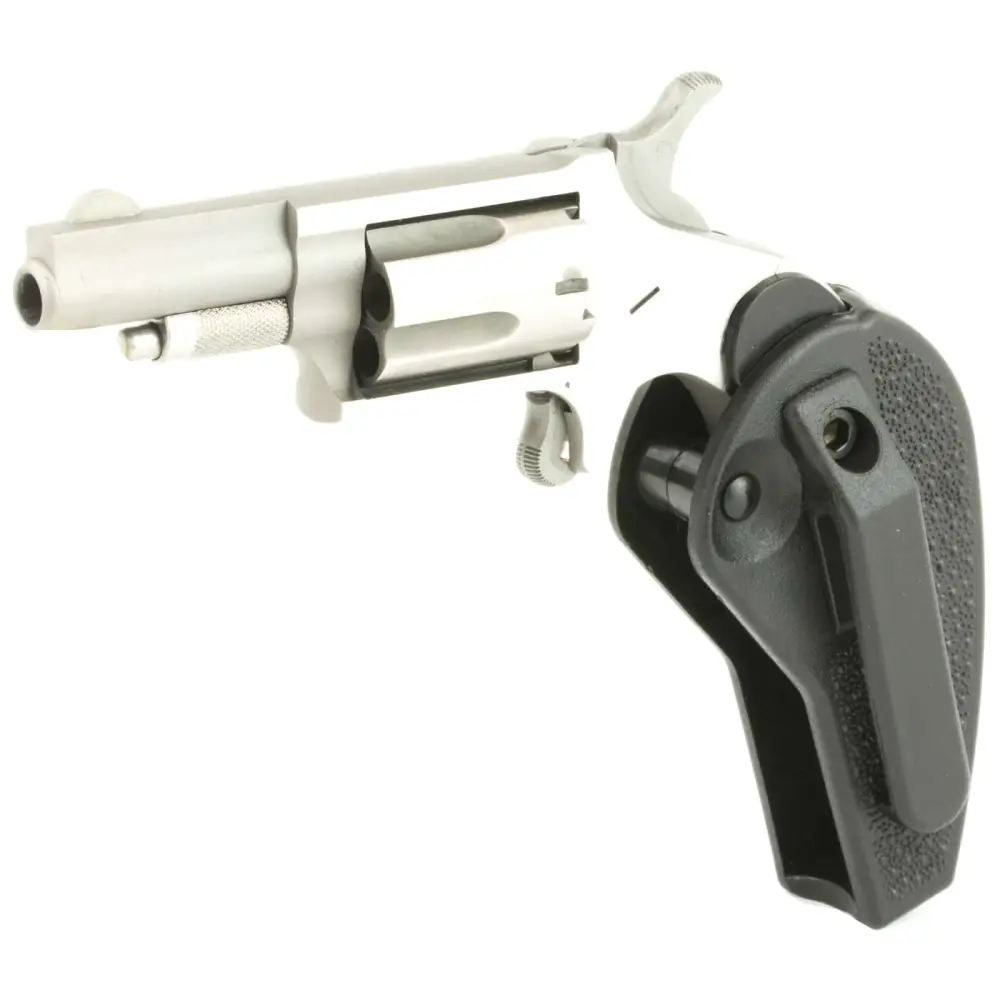 The Mini-Revolver series by North American Arms offers a lightweight concealed carry pocket gun with a 5-shot capacity. Using the half-way notch cylinder, the hammer may rest safely and securely away from live or empty chambers without chance of accidental discharge. The steel frame is fitted with a handy locking black holster grip with a pocket clip and fixed blade front sight. The holster grip unfolds and locks to become the handle of the gun. Press the release button and the mini-revolver folds back into the grip. For added safety, when the holster grip is folded, the trigger of the gun is completely enclosed making it virtually impossible for the gun to be fired.