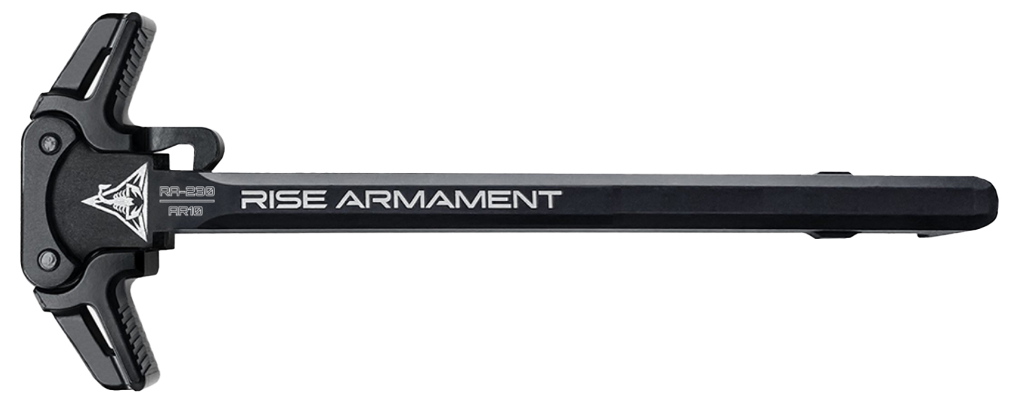 The ambidextrous latches facilitate quick and easy charging even if you’re wearing gloves or have optics mounted on your AR-10 rifle. The latches feature anti-slip grooves so you can pull the RISE AR-10 Ambidextrous Charging Handle with confidence each time. – It’s the ideal charging handle for both left- and right-handed shooters. – Precision machined from 7075 aluminum and a black anodize finish the RISE AR-10 Ambidextrous Charging Handle is built for performance and reliability. – Platform: AR-10 – Material: 7075 aluminum – Coating: Black: MIL-A-8625F Type II Class 2 hard anodize finish – Key Features – Ambidextrous latches for fast charging for left- and right-handed shooters – Easy to use with gloves on or optics attached – Anti-slip grooves on each latch – RISE Armament logo and name laser design – Durable finishing Black: MIL-A-8625F Type II Class 2 hard anodize finish – Precision machined from 7075 aluminum?for reliability – Made in Broken Arrow Oklahoma – Backed by RISE’s Lifetime Warranty