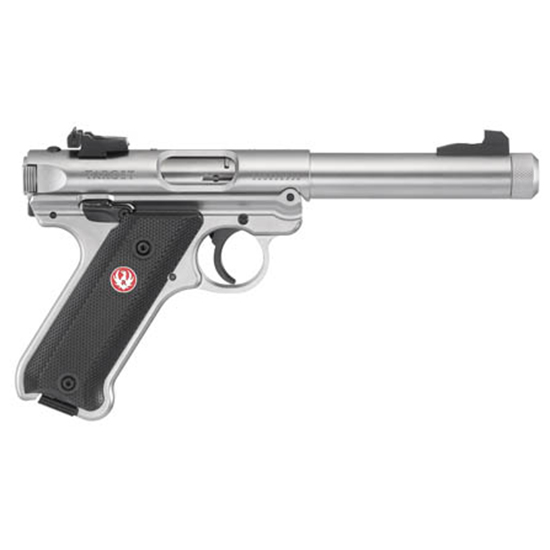 Caliber: 22 LR – Capacity: 10 – Material: Stainless Steel – Front Sight: Fixed – Barrel Length: 5.50 – Grip Frame: Stainless Steel – Grips: Checkered Synthetic – Finish: Satin Stainless – Width: 1.20 – Rear Sight: Adjustable – Barrel Style: Threaded Bull – Weight: 42.8 oz. – Overall Length: 9.75 – Height: 5.50 – Grooves: 6 – Twist: 1:16 RH – Simple one-button takedown for quick and easy field-stripping and proper chamber to muzzle cleaning. – A recessed button in the back of the frame allows the upper receiver to tilt up and off of the grip frame without the use of tools. – One-piece precision CNC-machined grip frame. – Ergonomic bolt stop. – Internal cylindrical bolt construction ensures permanent sight to barrel alignment and higher accuracy potential than conventional moving slide designs. – Contoured ejection port and easy-to-grasp bolt ears allow for durable and reliable operation round after round. – Accurate sighting system features adjustable rear sight and drilled and tapped receiver for Weaver- or Picatinny-style rail for easy mounting of optics. – Ambidextrous manual safety positively locks the sear in the SAFE position when applied. Safety can be converted to left-side only with included washer. – Features a conveniently located push-button magazine release on the left side of the frame. – Magazine drops free on release for faster reloading. – Magazine disconnect prevents discharge when the magazine has been removed. – Also includes: two 10-round magazines.