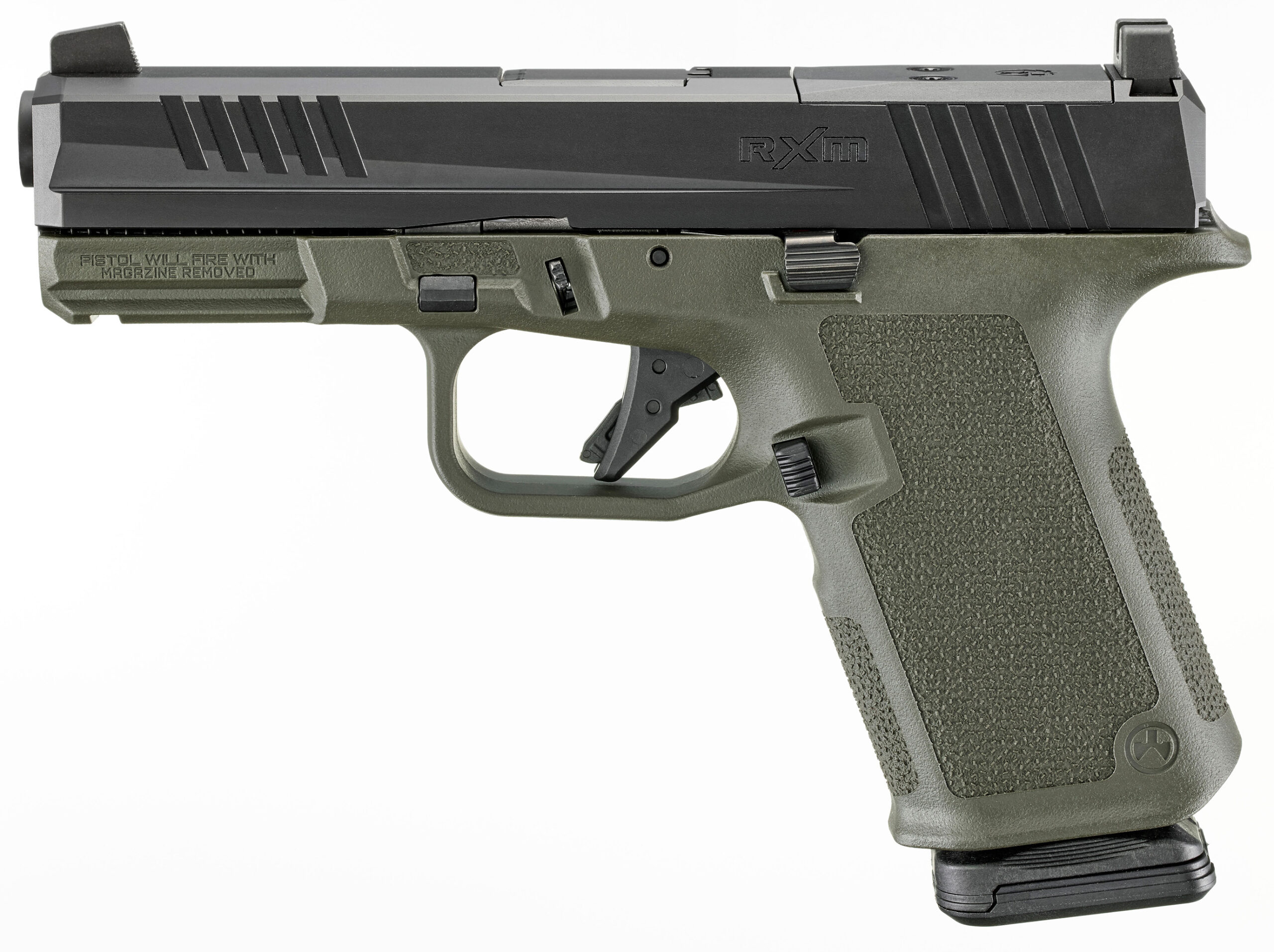 Caliber: 9mm Luger – Capacity 15+1 – Grip Frame OD Green Magpul Enhanced Handgun Grip – Front Sight Tritium Co-Witness Height – Rear Sight Steel Drift Adjustable – Manual Safety No – Magazines Included Two PMAG 15 GL9 – Optic Ready Yes – Overall Length 7.15 – Barrel Length 4 – Barrel Material Alloy Steel – Barrel Finish Black FNC Nitride – Slide Material Through-Hardened Alloy Steel – Slide Finish Black FNC Nitride – Slide Width 1 – Weight 23.2 oz. – Height 5.31 – Grooves 6 – Twist 1:10 RH – Removable serialized stainless steel Fire Control Insert (FCI) set inside an interchangeable Magpul® Enhanced Handgun Grip (EHG) for enhanced flexibility and customization. – Most major components are designed for Gen 3 compatibility with off-the-shelf parts holsters and accessories. – Magpul EHG features Magpul’s 3/4-scale TSP texture for a secure grip without discomfort or damage to clothing during concealed carry and textured indexing pads for consistent finger / thumb placement. – Other EHG features include: a low-profile flared magazine well for quick and easy magazine insertion; a trigger guard undercut and beaver tail that promote a high grip for better control; a magazine release scallop for easy access; and a universal-pattern accessory rail for use with a variety of lights and lasers. – Extended magazine release and raised slide stop. – Slide allows for direct optic mounting of RMR DPP and RMSc pattern optics. Co-witness-height steel sights feature a tritium night front sight providing an excellent sight picture with or without an optic installed. – Striker-fired with a flat-faced trigger smooth trigger pull and tactile reset. – Precision rifled alloy steel barrel with FNC nitride finish. – Safety features include integrated trigger safety internal striker blocker and inspection port that allows for visual confirmation of a loaded or empty chamber. – Also includes: two Magpul PMAG 15 GL9 15-round magazines and co-branded plastic carry case.
