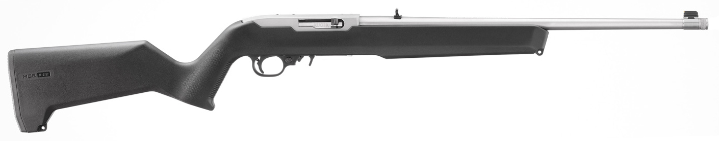 Caliber: 22 LR – Stock Black Magpul MOE X-22 – Front Sight Gold Bead – Rear Sight Adjustable – Barrel Material Stainless Steel – Thread Pattern 1/2-28 – Twist 1:16 RH – Capacity 10 – Barrel Finish Clear Satin – Weight 4.2 lb. – Overall Length 37 – Barrel Length 18.50 – Grooves 6 – The lightweight Magpul MOE X-22 Stock features M-LOK slots at the 6 o’clock position as well as Magpul’s own exclusive TSP texture on the pistol grip making it an ideal alternative to the standard Ruger 10/22 stock. – This legendary action is a tried and true Ruger design that ensures consistent reliable performance. – Detachable 10-round rotary magazine features a unique rotor to separate cartridges and provide reliable feeding. – Easy-to-use prominent magazine release provides smooth no-fuss removal of flush-mounted magazine. – Precision-rifled cold hammer-forged barrel with a 1/2-28 thread protector. – Positive push-button cross-bolt manual safety. – Combination scope base adapter for both Weaver-style and .22 tip-off scope mounts included. – Heat-stabilized glass-filled polymer trigger housing assembly is precision made of high-tech material for improved manufacturing tolerances impact and abrasion-resistance and an unmatched ability to withstand the elements. – The receiver and stock combine to create classic lines for attractive styling.