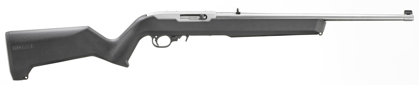 Caliber: 22 LR – Stock Black Magpul MOE X-22 – Front Sight Gold Bead – Rear Sight Adjustable – Barrel Material Stainless Steel – Twist 1:16 RH – Capacity 10 – Barrel Finish Clear Satin – Weight 4.2 lb. – Overall Length 37 – Barrel Length 18.50 – Grooves 6 – The lightweight Magpul MOE X-22 Stock features M-LOK slots at the 6 o’clock position as well as Magpul’s own exclusive TSP texture on the pistol grip making it an ideal alternative to the standard Ruger 10/22 stock. – This legendary action is a tried and true Ruger design that ensures consistent reliable performance. – Detachable 10-round rotary magazine features a unique rotor to separate cartridges and provide reliable feeding. – Easy-to-use prominent magazine release provides smooth no-fuss removal of flush-mounted magazine. – Cold hammer-forged barrel is locked into the receiver by a unique two-screw V-block system. – Positive push-button cross-bolt manual safety. – Combination scope base adapter for both Weaver-style and .22 tip-off scope mounts included. – Heat-stabilized glass-filled polymer trigger housing assembly is precision made of high-tech material for improved manufacturing tolerances impact and abrasion-resistance and an unmatched ability to withstand the elements. – The receiver and stock combine to create classic lines for attractive styling.