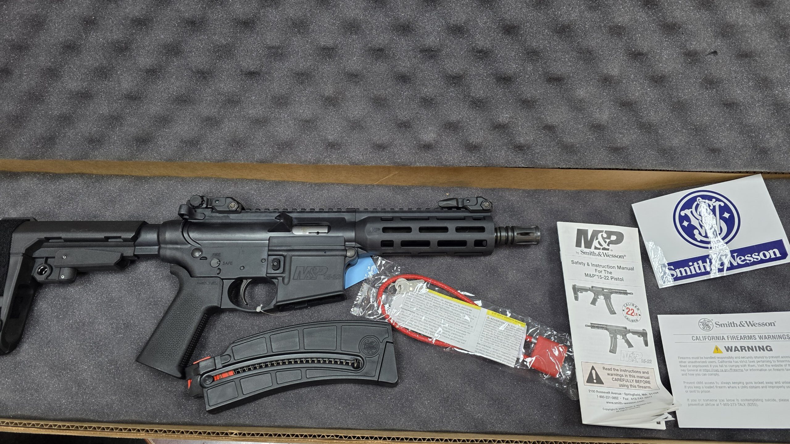 Smith & Wesson, M&P 15-22 Pistol, Semi-automatic, AR Pistol, 22LR, 8″ Barrel, Matte Black Finish, Pistol Stabilizing Brace, M-LOK Handguard, 25 Rounds, 1 Magazine, Magpul MOE SL Grip