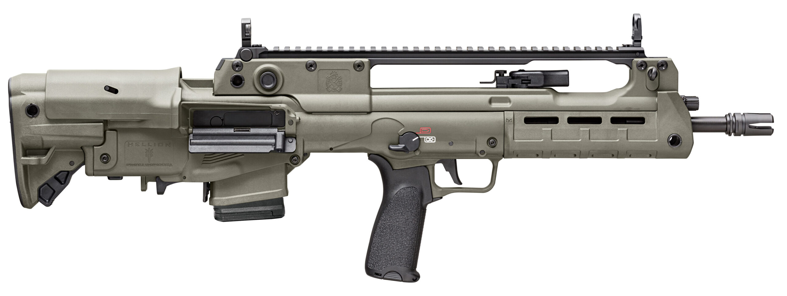 The low capacity Hellion featuring a new distinctive OD Green finish offers a fresh take on this 5.56mm semi-automatic rifle. Its bullpup design positions the action behind the trigger resulting in a compact 28.25-inch length while still maintaining a 16 barrel. Equipped with ambidextrous controls and a reversible case ejection system the Hellion seamlessly combines portability with potent performance and ships with a 10-round magazine for customers in restricted states. – Caliber 5.56x45mm NATO (.223 REM) – Color OD Green – Barrel 16 CMV Melonite® 1:7 – Front Sight Integrated Flip-Up Elevation Adjustable – Rear Sight Integrated Flip-Up w/ 5-Position Aperture Windage Adjustable – Bolt Carrier Group Proprietary Melonite® – Gas System 2-Position Adjustable Short Stroke Piston – Handguard Polymer M-Lok® – Stock 5-Position Adjustable w/ Cheek Riser – Muzzle Device 4-Prong Flash Hider – Charging Handle Ambidextrous Non-Reciprocating – Safety Switch Ambidextrous – Grip BCMGUNFIGHTER Mod 3 – Magazines (1) 10-Round Magpul PMAG Gen M3 – Weight 8 lbs – Length 28.25-29.75