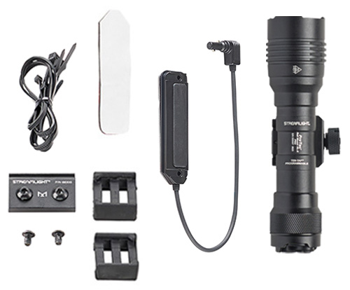 The ProTac® Rail Mount HL-X Pro is a long range low-profile gun-mounted light that produces 50000 candela and shines for 447 meters. Its Jack-Cap tail cap switch offers operational switch redundancy with both push-button operation or remote pressure switch operation. – Multi-Fuel: Uses one (1) Streamlight SL-B26® protected Li-Ion USB rechargeable battery pack; also accepts two (2) CR123A lithium batteries – TEN-TAP® programming allows for selection of three different operating programs: – 1) high/strobe 2) high only 3) low/high – High: 1000 lumens; 50000 candela; 447m beam distance; runs 1.25 hours (CR123A); runs 1.75 hours (SL-B26) – Low: 60 lumens; 3100 candela; 111m beam distance; runs 21 hours (CR123A); runs 24 hours (SL-B26) – Strobe: runs 2.5 hours (CR123A); runs 3.5 hours (SL-B26) – Available as Light Only or System – System includes remote pressure switch Jack-Cap tail switch remote retaining clips double-sided tape zip ties and M-LOK® mount – Integrated rail clamp attaches to MIL-STD-1913 (Picatinny) rails – Easy to attach secure mounting – Durable anodized aluminum construction with impact-resistant tempered glass lens – IP67-rated; waterproof to 1 meter for 30 minutes (without remote pressure switch installed); IP54-rated; water-resistant (with remote pressure switch installed) – Limited lifetime warranty – PROTAC RM HL-X PRO- System includes Jack-Cap M-LOK Kit Straight Momentary Pressure Switch Hardware Kit 2.5mm Allen Wrench 2 CR123A Batteries