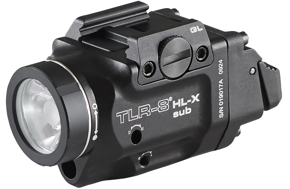 The TLR-8® HL-X sub high-lumen rail-mounted light is engineered to produce a longer reaching beam. It accepts either Streamlight’s SL-B9® USB-C rechargeable protected lithium-ion battery pack or a single CR123A lithium battery. Interchangeable rear paddle switches accommodate your shooting style. – Multi-fuel: Uses (1) Streamlight SL-B9® protected Li-Ion USB-C rechargeable battery pack (included) or (1) CR123A lithium battery – Engineered to produce a longer reaching beam – SL-B9: 1000 lumens; 10000 candela; 200m beam; runs 30 minutes (default) or programmable to 500 lumens; 5000 candela; 141m beam; runs 1 hour – CR123A: 500 lumens; 5000 candela; 141m beam; runs 1.5 hours – Laser mode runs 29 hours – Ambidextrous rear paddle switches with HIGH and LOW options – Safe-off feature prevents accidental activation; saves batteries – Rail grip clamp securely attaches/detaches without putting your hands in front of the muzzle – Durable anodized machined aluminum construction – User-enabled strobe function – Securely attaches to select subcompact handguns: GLOCK® 43X MOS/48 MOS and GLOCK® 43X RAIL/48 RAIL SIG SAUER® P365® and P365® XL (closed rail systems)* and the Springfield Armory® Hellcat® as well as select 1913 short railed subcompact handguns including the Smith & Wesson® M&P® M2.0® subcompact Beretta® Px4 Storm subcompact Springfield Armory® XD-E XD-S® and Hellcat® Pro Heckler & Koch® HK45 compact and SIG SAUER® P365® XMACRO – Length: 2.51 in (6.38 cm) – Weight w/ SL-B9: 2.87 oz (81.4g); Weight w/ CR123A: 2.77 oz (78.5g) – IPX4 water-resistant – Limited lifetime warranty – Assembled in the USA – Product Specifications – High Lumens 1000 – Beam Distance 200 meters – Max Candela 10000 – Battery Type SL-B9 Rechargeable Battery Pack CR123A Lithium – Battery Quantity 1 – Length 2.51 inches (6.38 centimeters) – Weight 2.77 ounces (78.53 grams) 2.87 ounces (81.36 grams) – Colors Black