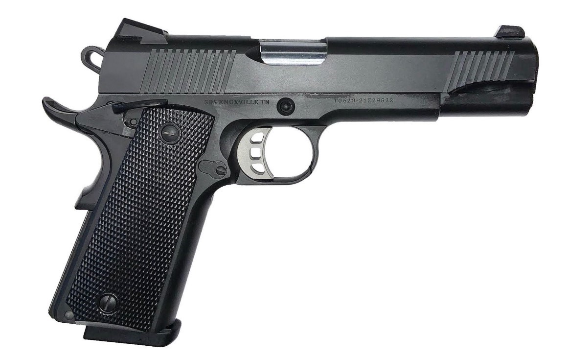 Manufacturer: SDS Imports Model: Tisas 1911 Caliber: 45 ACP Type: Pistol Action: Semi Automatic Barrel Length: 5″ Finish: Cerakote black Capacity: 8 The 1911 Duty B45 is an upgraded 1911 in 45ACP with many high end features at a very resonable price. – Hammer forged stainless steel barrel – Black Cerakote finish – Novak style three dot sights – Flared ejection port – Extended beavertail style grip safety – Slide release lever take down hole chamfered – Enhanced hammer and trigger – Extended and ambidextrous thumb safety – Beveled magazine well – Trigger housing undercut – Flat main spring housing – Series 70 internals – Includes one 8 round magazine, cleaning brush and owners manual.