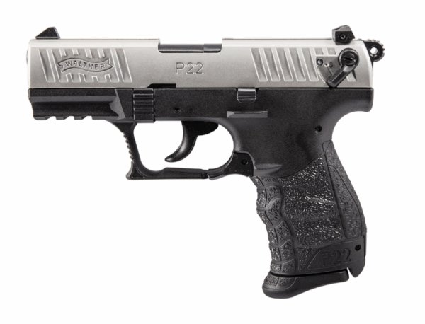 Walther’s P22 is at home on the shooting range, or around the camp. It features a contemporary styling and performance design concepts from Walther centerfire handguns, captured recoil spring, and decocker built into the safety. The P22 utilizes a threaded barrel, Picatinny rail, and low profile three-dot sights. The slide features front and rear slide serrations, loaded chamber indicator, and external slide stop locks. This QD model has a 3.42″ barrel, black frame with nickel slide, interchangeable backstraps, and comes with a 10-round magazine.
