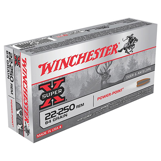 Super-X ammunition has provided exceptional quality and outstanding performance for all types of hunters and shooters who rely on its time-proven dependability backed by legendary excellence. – Caliber: 22-250 Remington – Bullet Type: Power-Point – Bullet Weight: 64 gr – Muzzle Energy: 1741 ft / lbs – Muzzle Velocity: 3500 fps – Boxes Per Case: 10 Boxes Per Case – Rounds Per Box: 20